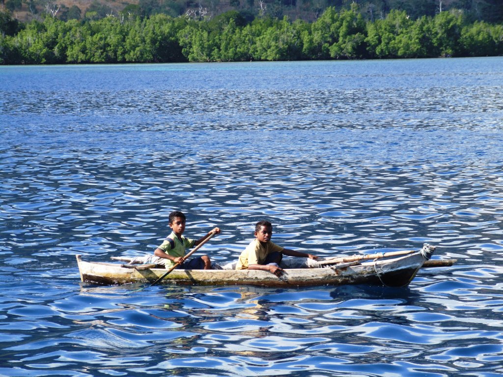 Although the wind picked up a little, it was almost dead astern and not strong enough to push us far so we motor-sailed through the day to our planned anchorage in Telek Balurin Bay on Lomblen. The waters here are incredibly deep and clear taking on an amazing cobalt blue colour which despite our best efforts couldn’t capture properly on camera. We dropped anchor just offshore mid afternoon in crystal clear water between two coral reefs and quickly broke out the snorkelling gear to check out the reef. Indonesia is so heavily populated that there are very few uninhabited places as bays like this everywhere support small fishing communities. As eight yachts and catamarans progressively arrived to fill the small anchorage the local kids soon arrived in dugout canoes with welcoming “Halo Meesters” all round. We left Darwin with a small supply of note pads, pens and pencils to give away to children which we have all but exhausted already. Forget chocolates or lollies, something as basic as a pencil is a much higher prized gift to these kids and makes us realise how much we take for granted at home.